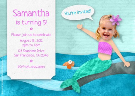 Your guests will be giggling with excitement when they see these funny and adorable cards. Send off your little one’s pic to Happy Cat Printables and they will turn her into a virtual mermaid! The invitation is then sent as a jpg or pdf file so you can print out as many as you’d like.