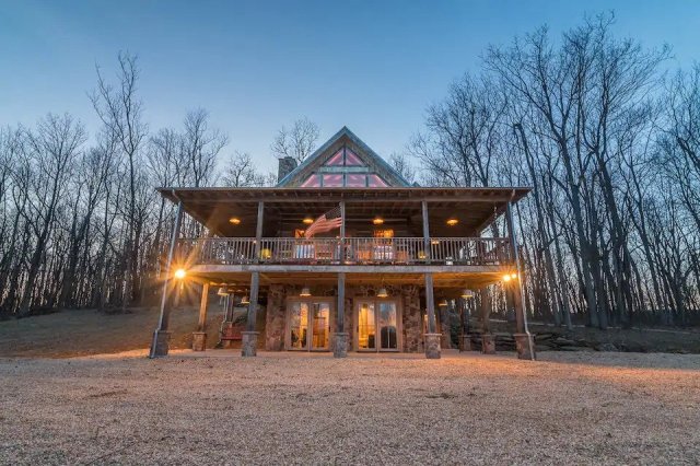 This secluded cabin sleeps 16 and is perfect for your next family gathering. Grill at the outdoor BBQ or cook up a meal in one of the cabin's two kitchens. There are six bedrooms and plenty of outdoor space for exploring.
