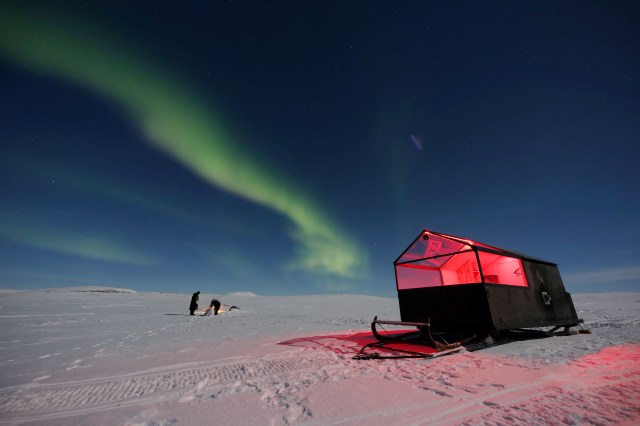 The Wilderness Camp in Kilpisjärvi, Finland is made up of three mobile sleeping huts, which are placed in the best possible locations to view the Northern Lights each winter season. Each hut has a gas stove, super-wide bed, table, heater, dry toilet and includes the use of snowshoes and kicksleds. Their most amazing feature is the glass roof that allows guests to lie back and gaze out at the stars (and hopefully the aurora), making for a truly unforgettable experience. You will be transported by snowmobile to your hut in the evening and left to enjoy the wilderness and the aurora alone. Local snacks and hot drinks are included as well as an Arctic grill for dinner and breakfast the following morning. Children are welcome to join this adventure and share the extra-large bed with their parents (each hut only has one bed).