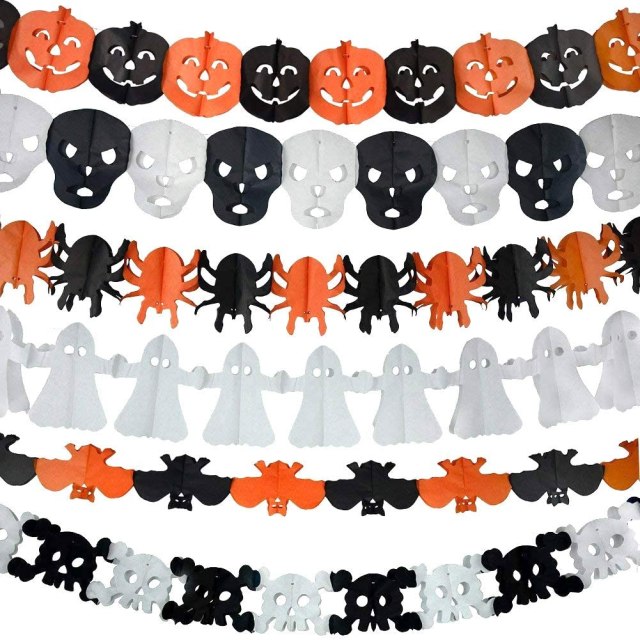 Skulls, pumpkins, ghosts, spiders and bats––the gang's all here! Whether you're hosting a Halloween bash or just decorating your home for fun, there are plenty of ways to use these adorable paper garlands. Each garland is about 10 feet in length, so there's no limit when it comes to spooky creativity.