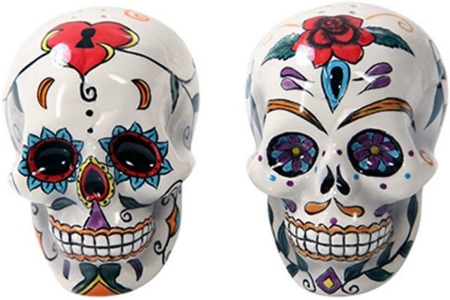 We are so in love with this set of sugar skull salt and pepper shakers! The bright colors and intricate illustrations would make a good addition to any table long after Halloween and Día de Los Muertos are over.