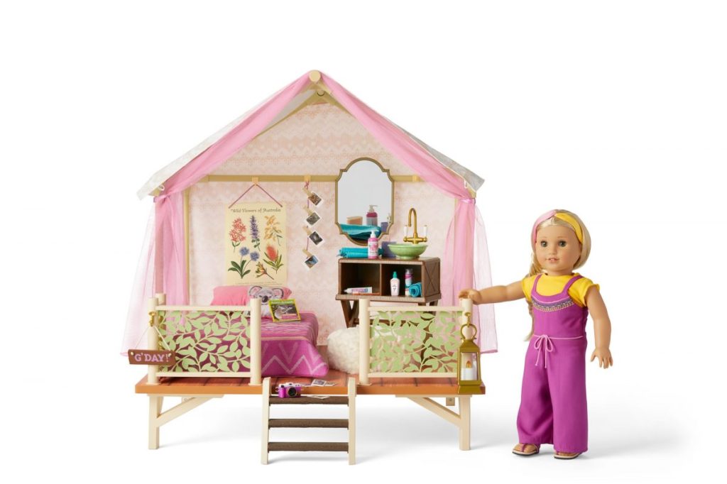 Bringing the stories to life is a beautiful 18-inch Kira doll, featuring green eyes and long, wavy blonde hair, that comes dressed in a tie-dye tank, sporty skirt, and lace-up boots perfect for bushwalking. Kira’s signature accessories include an outdoor backpack with koala keychain and a wide-brimmed hat to protect her from the Australian sun. Girls can choose from several other Australian-inspired outfits, including Kira’s girl-and-doll koala PJs, as well as adorable plush animals like a kangaroo and joey, koala, and a wombat (part of Kira’s Wildlife Rescue Set). To extend the play further, there’s Kira’s Animal Exam Table and Comfy Platform Tent—both with over 20 authentic accessories—to fuel girls’ imaginations.