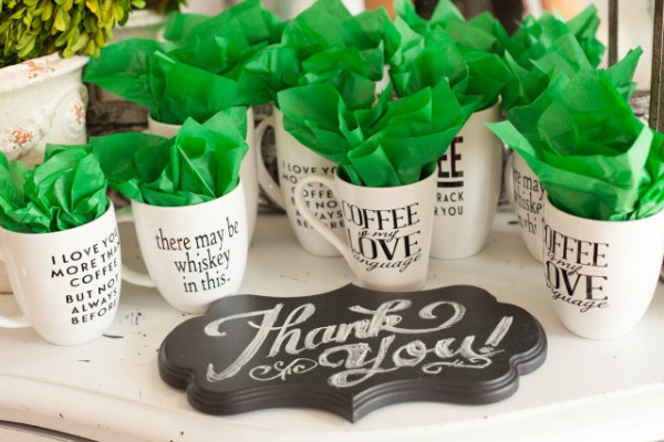 Celebrate the coffee the new mom will need to stay up after all those sleepless nights with baby with a “Coffee and Cravings” shower theme, courtesy of Paula of Frog Prince Paperie. Her shower included custom coffee mugs that doubled as favors so guests could enjoy their favorite brew at home. You can choose matching mugs or a variety with funny messages or sweet sayings.