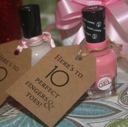 You can never have too many nail polishes, so send guests home with the perfect shade of pink or blue nail polish to use at their next mani or pedi. Wrap each bottle in one of these sweet labels (5+) from Etsy shop Recipe Box Designs; the tags come in a variety of colors to match your event.