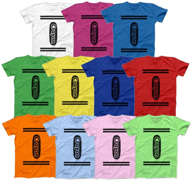 Dress your whole family in colorful crayon onesies and t-shirts. These come in baby bodysuits, toddler t-shirts, youth shirts, women’s slim tees, and men’s tees and an array of bright colors.