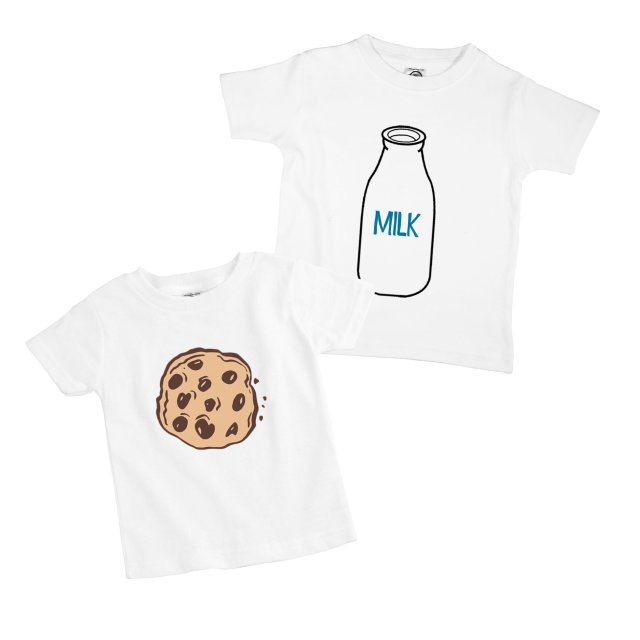 2. Milk & Cookies: Your little ones will be the treat this year in adorable milk & cookies t-shirts or onesies. Add a white hat and leggings for the milk carton and brown duds for the cookies. These Spunky Stork twin sets also come in other favorite food combos: PB&J, biscuits & gravy, pancakes & syrup, avocado toast, and fish & chips.