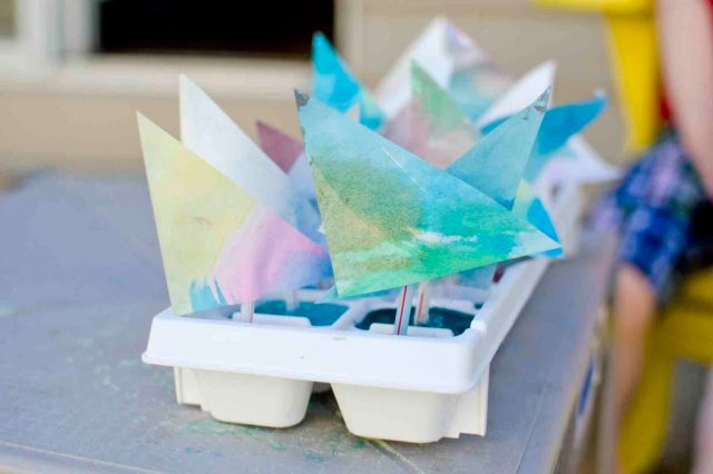 Ice cubes are a great way to stay cool on a hot summer day. These colorful ice boats from Busy Toddler are easy to make and will capture your toddler’s attention—at least for a few minutes. Prep the boats ahead of time (think nap time!), then let sail them in an outdoor water table, bucket, or inflatable backyard pool. Kids can move them across the water and watch the colored cubes melt.