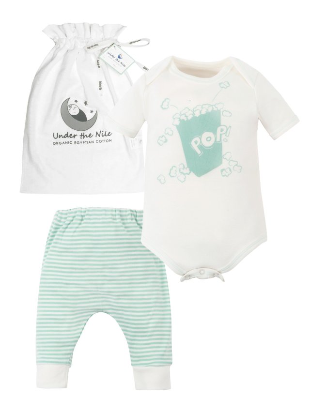 Under the Nile's baby one-pieces are made from Egyptian organic cotton, ensuring they're super-soft and comfortable. Bonus: The lap shoulder design or snaps allow for quick and easy dressing. You can even pull the garment down instead of over the head (which is a little parenting hack for those sudden diaper blowouts!). They also come in sets with matching pants, like the popcorn print shown above. Also, check out their best-selling footies for those brisk autumn nights.