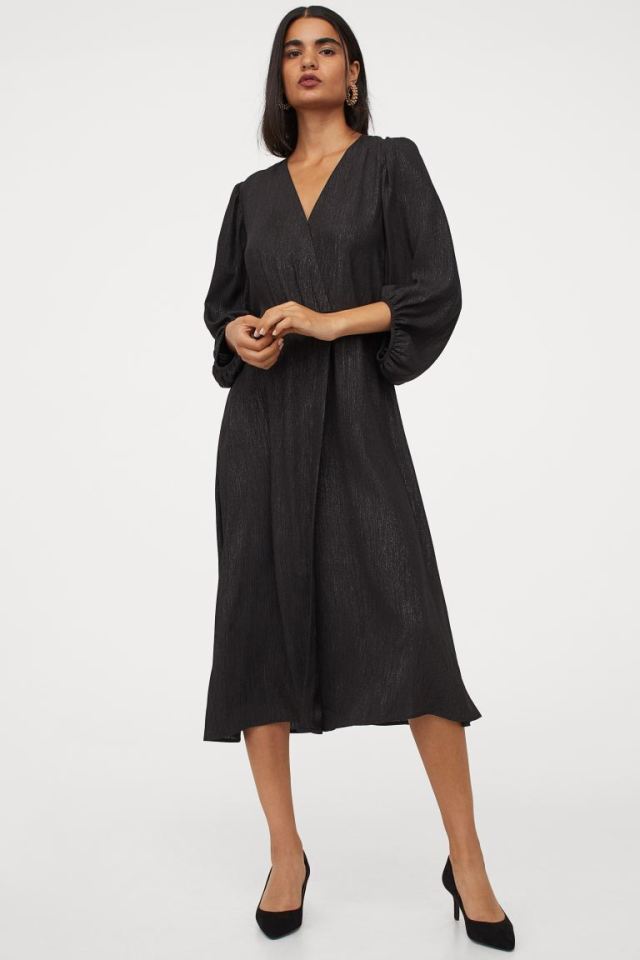 Gorgeous doesn't have to mean expensive—it's just that simple. Save your pennies and look amazing in this balloon-sleeved wrap dress from H&M. The calf-length dress in woven, crinkled fabric is a V-neck with sewn-in wrapover at the front, which allows for extra room for your baby to grow.