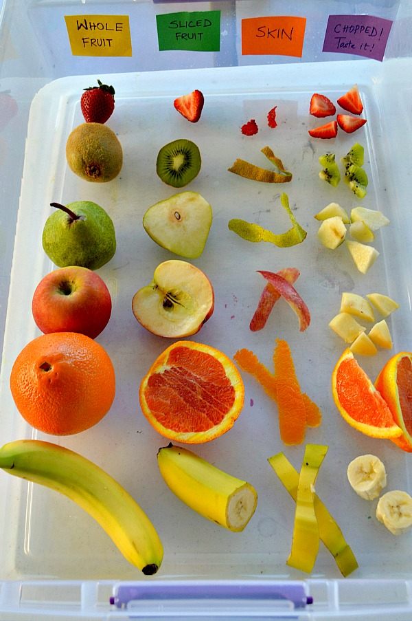 If your child has started eating solids, it's a great time to try this sensory exploration from Fun Littles. Set up a tray of fruit in varying forms and let baby examine and smell each one, and and even have a taste. As they do, you can point out the different colors, textures and scents of each fruit.