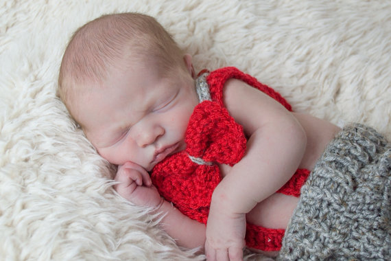 Dress your newborn boy up like a little man for maximum cuteness. This soft and sweet handmade getup includes crocheted pants and suspenders in addition to the bowtie.