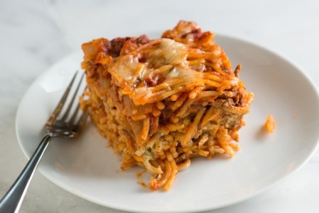 Home Recipes Baked Spaghetti with Creamy Pesto By writerredtriNovember 5, 2012 Search more like this beefground-beefstirpastaspaghettisaucesaltsour-creamcupteaspoonolive-oilspraypanrecipe Read next Recipes The Best Organic Clothes for Babies & Toddlers Recipes 45 Pumpkin Carving Designs That’ll Wow the Neighborhood Recipes Target’s Best Holiday Deals Start Sooner Than You Think Recipes This Larger Than Life Mister Rogers Monument is Exactly What the World Needs Recipes Want a Free Donut on Halloween? Here’s How to Get One from Krispy Kreme What’s not to love about baked pasta with ground beef, marinara sauce, and a layer of creamy pesto? Your kids will gobble up the twist on the classic red sauce spaghetti. And, if you’d rather go meatless, merely omit the ground beef. It’ll taste just as good without the meat. Ingredients: 1 pound (453 grams) dry spaghetti pasta 1 tablespoon olive oil 1 medium onion, chopped 1 pound (453 grams) lean ground beef 1/2 teaspoon salt Two 26-ounce jars (1474 grams) marinara sauce 3/4 cup (175 grams) sour cream 1/4 cup (60 grams) basil pesto 1/2 cup (40 grams) shredded mozzarella cheese Method: 1. Heat oven to 350 degrees F (177 degrees C). Spray a 3-quart baking dish with non-stick cooking spray or lightly grease with butter. (A 13-inch by 9-inch pan works well for this). 2. Bring a large pot of salted water to a boil then add spaghetti and cook according to the package directions (this usually takes about 10 minutes). Then, drain pasta. 3. In a small bowl, stir the basil pesto and sour cream together, and then set aside. While the pasta cooks, heat the olive oil in a large skillet or frying pan with sides. Then, add onions then cook 3 to 5 minutes, stirring occasionally, until translucent. 4. Now, add the beef to the onions. Scatter a 1/2 teaspoon of salt over the beef then use a spoon or fork to break the beef apart. Cook, stirring occasionally, until the beef has browned. This takes about 6 minutes. 5. Drain extra fat from the beef then add tomato sauce and cook, while stirring until heated through. A special thanks to Inspired Taste for this recipe. Head on over to their site for step-by-step photos of this recipe.