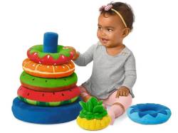 This happy stacker has everything toddlers need to make the ultimate burger, plus the middle of the pieces pop out to make a ring toss game!