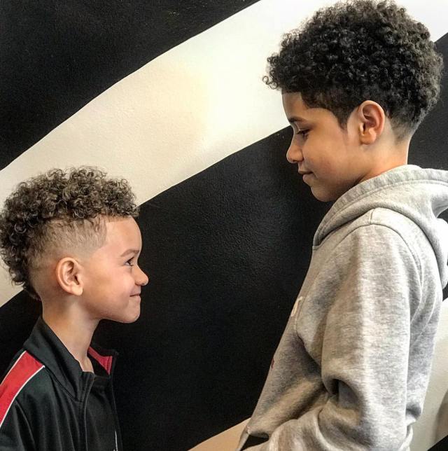 Tame those curly tresses with a neat fade. The kids will score cuteness points for matching back-to-school hairdos like this duo. Don't forget the curl treatment before styling!Â