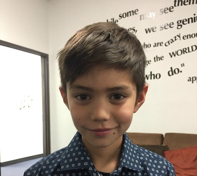 Not all boy haircuts have to be short. Side bangs and layers make this longer look manageable. A little bit of gel to keep it contained, and he's ready to go!Â