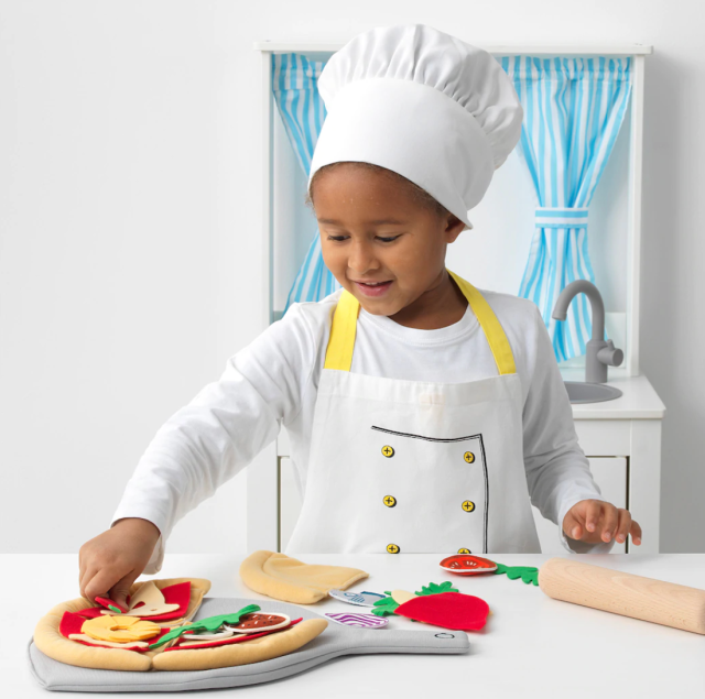 Complement his new kitchen with a soft pizza set. Kids can add toppings, toss and "eat" to their heart's desire. It comes with 24 pieces, including sauce, cheese, arugula, pepperoni and more.