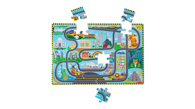 Work together with your tot to build this puzzle with all the vehicles, some soaring through the skies above while others cruise on the streets below. We love the large pieces that are easy for toddlers to manipulate and the bold, beautiful design.