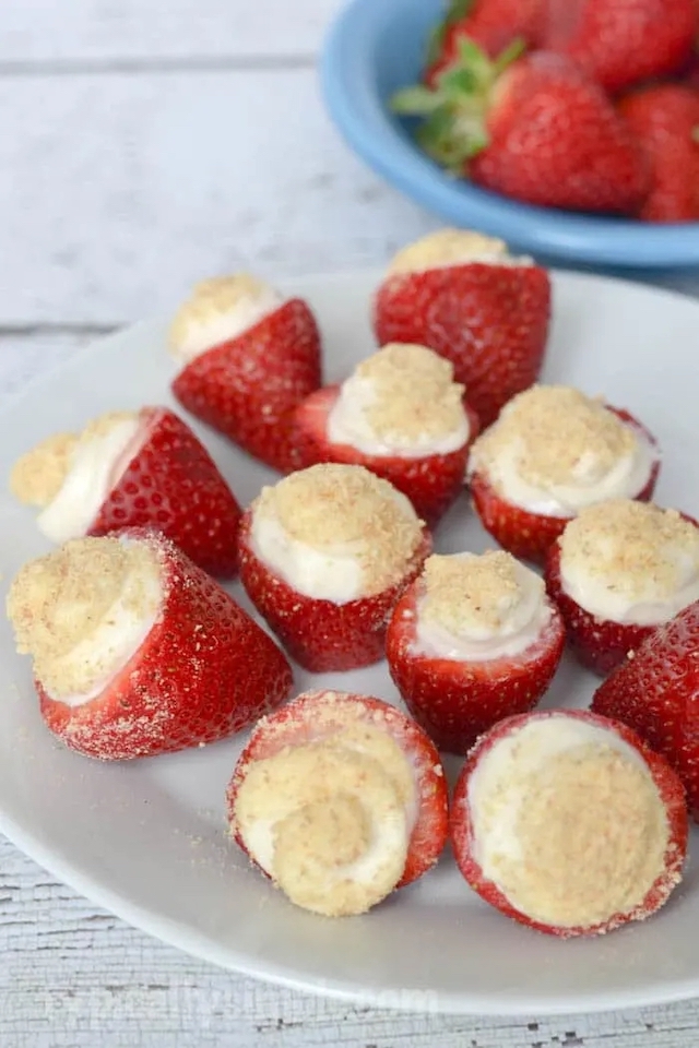 Raise your hand if you do NOT want to do any baking for your upcoming birthday party. These no-bake strawberry cheesecake bites from Typically Simple are here to save the day! A simple filling goes into fresh strawberries, then dipped in graham crackers for the perfect bite-sized snack for both kids and adults.