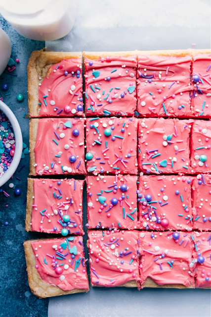 No need to whip up dozens of individual cookies when you have Chelsea's Messy Apron recipe for sugar cookie bars. Made in one pan, this chewy and soft cookie is topped with homemade buttercream frosting and sprinkles. Make it yours by customizing with your own party colors!