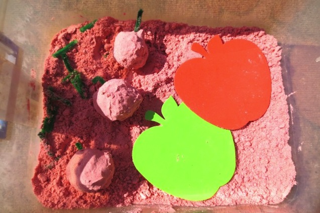 As sweet as mom’s apple pie, this scented fall sensory bin will spice up playtime for babies. The cloud dough is made from a simple recipe of flour, vegetable oil, and apple pie spice, so it’s non-toxic if nibbled. Add some apple-shaped foam pieces, scoopers, and muffin tins to develop small motor skills. If you don’t have any apple spice handy, Growing a Jeweled Rose recommends using cinnamon.