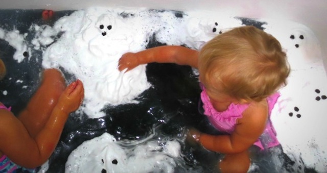 Scare up some bath-time fun for your little boo! Shaving cream makes perfectly puffy ghosts that glide over dark-colored water in this fun activity. Don’t worry about the tub or your tot staying food-colored; it washes away when playtime is over. Get the DIY from Growing a Jeweled Rose.