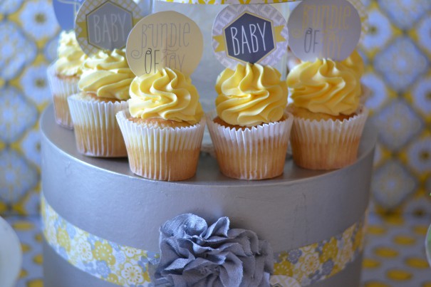 While yellow is a classic hue for the "waiting to be surprised" crowd, this party gives it a trendy twist by pairing it with grey. A patterned fabric garland created a beautiful backdrop, while yellow frosted cupcakes on a stand made from hat boxes added interest to the dessert table.