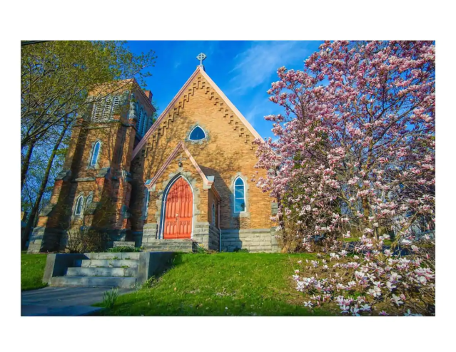 You'll love this renovated cathedral/castle as it's a great space for extended family to gather. There are five private bedrooms and a large gathering space and table for group meals. There's only a kitchenette so plan ahead for meals.