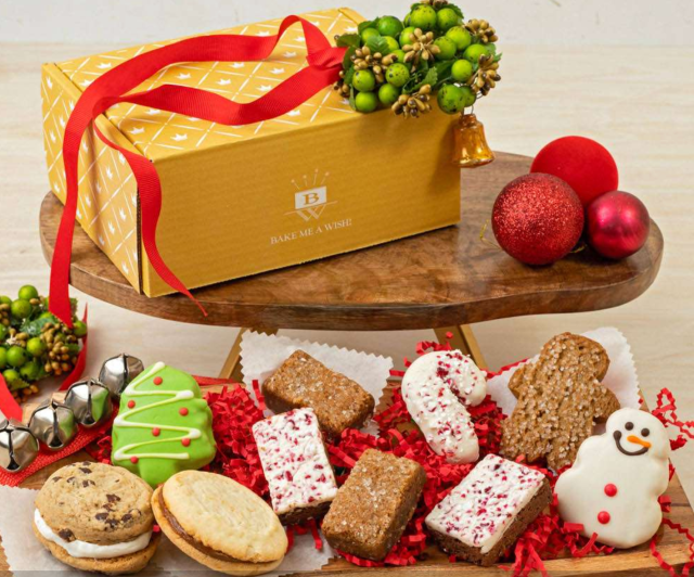 Bake Me a Wish has a ton of variety when it comes to having holiday treats delivered. You can order chocolate cakes, key lime pies, New York cheesecakes, cookies, brownies, and even fruit and nut trays. They also have treat towers and holiday-themed gifts like jumbo holiday cupcakes and candy cane cookies.