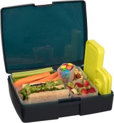 $25 BUY NOWThese bento boxes for kids feature five spill-proof compartments including a sauce tray for packing lunches and snacks for school or daycare with ease. The two clip closures keep the bento box securely closed in transit but are easy for kids and toddlers to open. The fully removable top gives easy access to contents and has no hard plastic hinges that can pinch little fingers! The entire set, including utensils, is dishwasher safe for easy cleaning. The bottom tray and the inner tray lid are microwave safe, making it ideal both for hot and cold food.