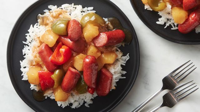 Polynesian Sweet and Sour Hot Dogs with Rice