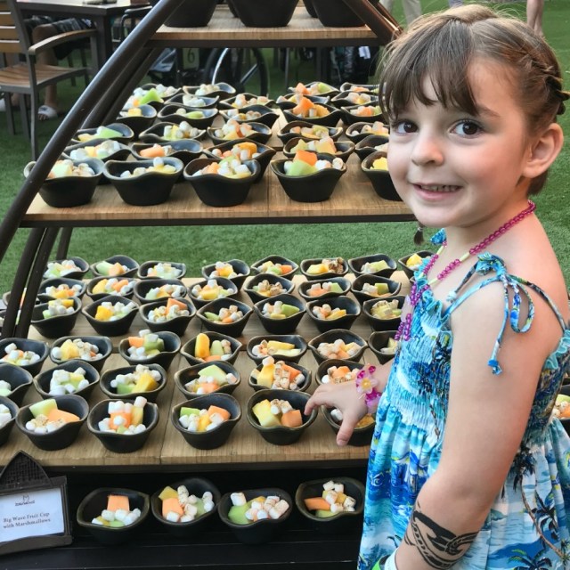 Makahiki is where the character breakfast is held but you can also pop into this spot for lunch and dinner. ‘AMA’AMA is the fanciest restaurant on the property with a view of the ocean and spectacular sunset to boot but don’t let the word “fancy” stop you. It’s absolutely kid-friendly with menu items totally catered to kid’s preferences. We highly recommend going there at least once, with or without the kids. Lille ‘Opihi’s, The Lava Shack and Papalua Shave Ice is where you can snag snacks and post-pool fuel-ups during the day.