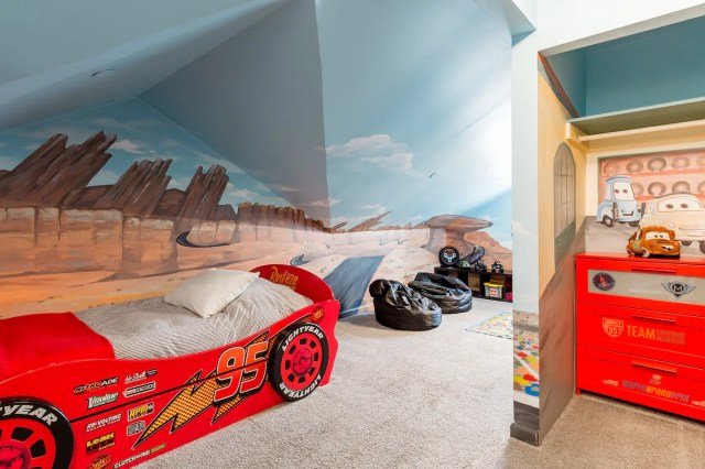 Want to save your money for all the things your kids will inevitably want to buy when you get to Disneyland? This 6-bedroom house is within walking distance to Disneyland and has enough Mickey-themed touches to get everyone in the spirit (while being budget-friendly). Walk inside the one-story abode and you’ll be met with floor-to-ceiling red, black, and white (Mickey’s favorite colors), with one room done in Dalmatian dots and another in big red and white spots. There’s also a “Fairies Room” with a castle bunk bed and a painted mural on one wall, and a Cars-themed room has a bunk bed and toddler Lightning McQueen racecar bed. In all, the place sleeps 16… all for less than a single hotel room might cost you elsewhere (of course, the inevitable Airbnb fees might change that).