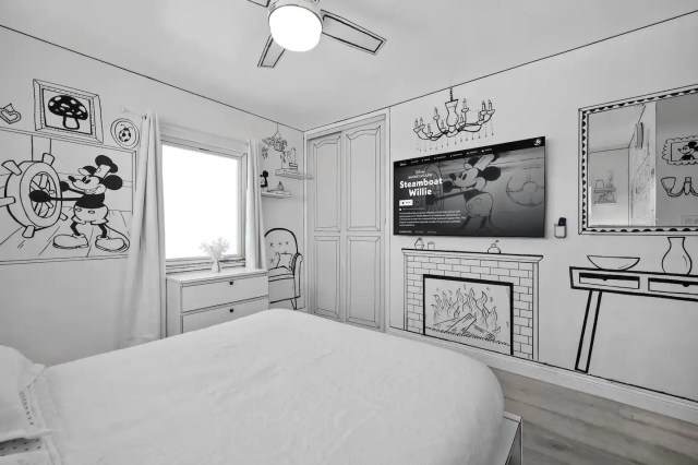 This house is an immersive ode to all things Disneyland. Its four bedrooms recreate the spirit of the park, with each room themed after a different area: There’s a vintage Mickey room (above) that will make you feel like you’ve stepped foot into a black-and-white cartoon; a “Frontierland” room that feels like a woodsy cabin, with a real, working train that chugs in and out of the room on a track by the ceiling; an “Indiana Jones” room, with genie lamps perched on shelves and old maps clinging to the wall; and an “It’s a small World” room that has the iconic Small World facade painted on one wall and odes to the ride scattered throughout (it also has two bunk beds and a trundle so the room can fit a small world of its own!). There’s also an arcade and theater room that will keep the kids busy for hours.