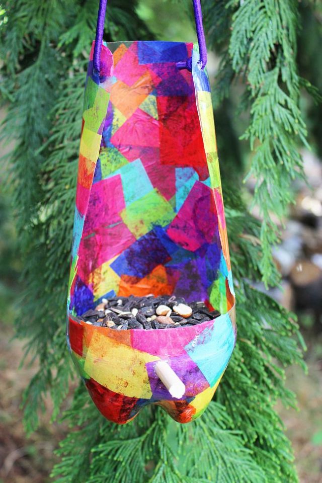 The vibrant colors of this recycled bird feeder really pop against the tree’s green leaves. Made using an empty soda bottle, and assorted hues of tissue paper, you’ll find a full list of materials and the step-by-step instructions over at Artzy Creations.