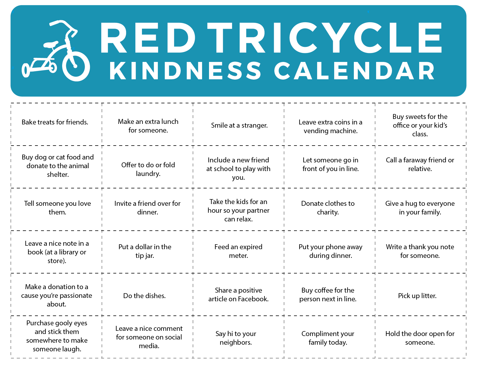 Home Download Our Kindness Calendar! By Christal Y.February 17, 2020 Search more like this kindnessactdownloadwayfillfeature Read next Honoring Everyday Heroes This Halloween Most Americans Steal Their Kids’ Halloween Candy (& More Spooky Season Facts) Is Halloween Scaring Your Kids? Here’s How to Help Them Conquer Their Fear Want to Make Halloween Safe & Sweet? Think like a Kid The Ultimate Gift Guide for Little Scientists Don’t let your acts of kindness start and stop on National Random Acts of Kindness Day! We created a Kindness Calendar filled with 30 ways you can share a bit of happiness every day. Click here to download our “Kindness Calendar” for your fridge and then tell us how many you are able to accomplish! featured image: moseshar via Pixabay RELATED STORIES This Dad Tried Kindness When Confronting His Son’s Bully & It Was So Necessary 76 Random Acts of Kindness Anyone Can Do 13 Fred Rogers Quotes About Kindness & Humanity