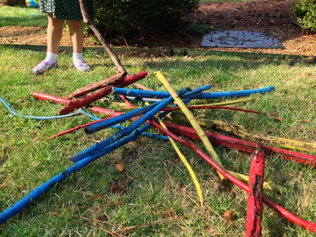 Instead of playing pick-up sticks with the chopstick-sized sticks of our youth, why not spray paint the sticks in your yard and play with those, instead? Bonus: Guess who helps you gather the sticks out of your yard? And they say they’re too young for yard work. You can thank I Heart Naptime for the great idea.