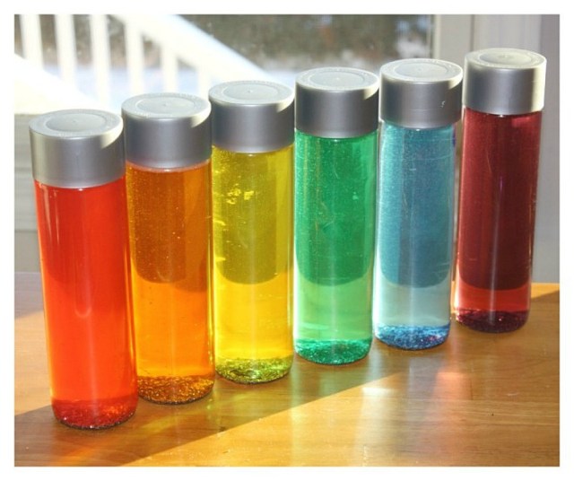 Sometimes the kids don’t need activities that get them fired up. There’s something to be said for chilling out and relaxing—without using a screen to soothe. Check out the glittery, rainbowy, super-colorful calm down bottles from Little Bins for Little Hands.