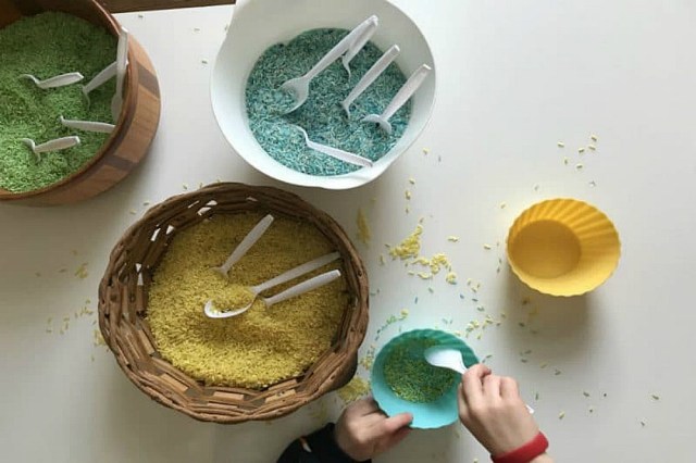 Play ideas don’t need to be overly complicated or fussy. A rainbow of colorful rice is a standout sensory play activity. Add in a counting and memory/recall extension, like this one from Hands On As We Grow, and you have a recipe for learning on more than one level.