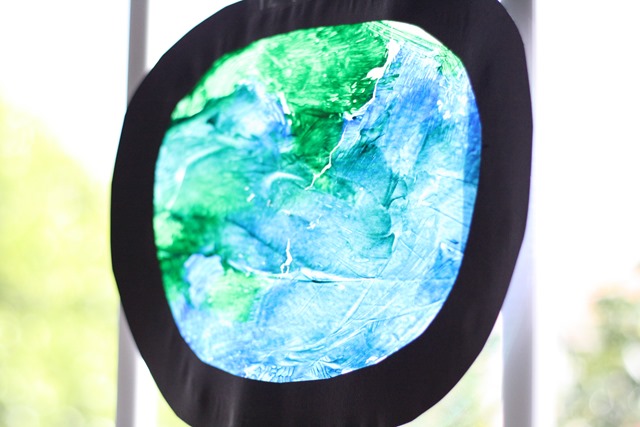 This easy peasy craft from Royal Baloo just requires wax paper, paint, brushes and a little black paper. Kiddos can express themselves creatively, then trim into an earth shape and hang in a window for a gorgeous stained glass effect.