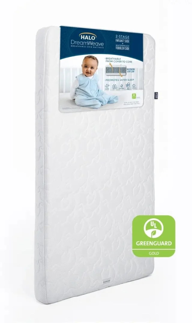 Babies spend over 60% of their first years sleeping, making a crib mattress the most utilized baby product ever! But if they’re laying on a traditional mattress, that means they spend over 60% of their time inhaling VOCs, too. So, HALO® created DreamWeave— a dual-sided mattress that is totally free of chemicals, totally breathable, totally washable, totally waterproof, hypoallergenic, and GreenGuard Gold certified!