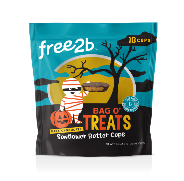 Halloween can be tough for kids with food allergies. That's where free2b comes in. Their line of sun cups and mint cups are top 12 allergen-free, and free from artificial flavors, colors, sweeteners, preservatives, hydrogenated oils, palm oil and carrageenan, as well. The entire line is Non-GMO Project Verified, Certified Gluten-Free, Certified Vegan, Kosher Pareve and Fair Trade Certified.