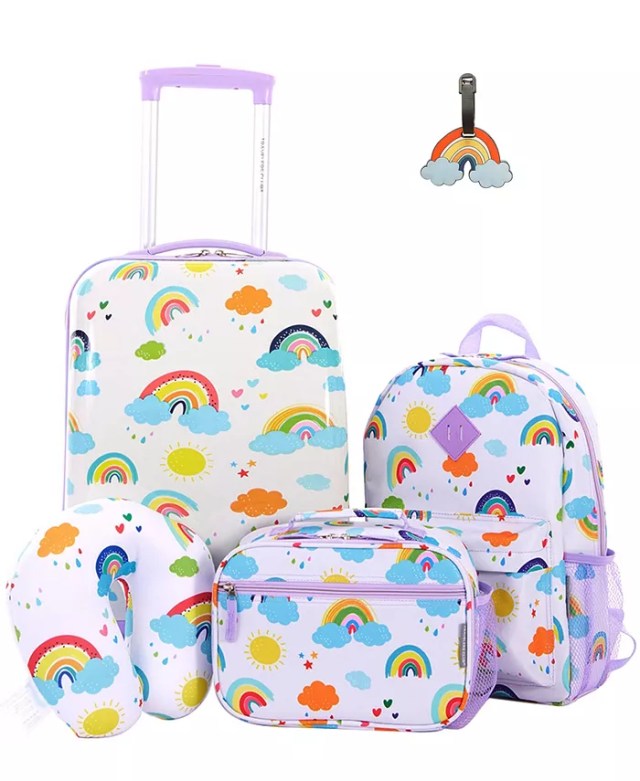 Take care of everything your little ones need with this 5-piece luggage set! It includes one hard side carry-on spinner, backpack, neck pillow, lunch bag, and luggage tag.