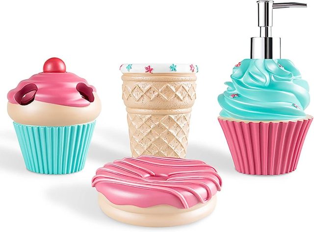 It's hard to find a sweeter set. With a cupcake soap dispenser, donut soap holder, cone cup, and toothbrush holder, there's also a coordinating shower curtain and wall prints available, all on Amazon.