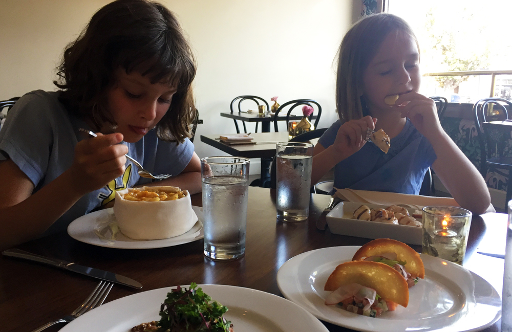 Let’s say you want special family meal. Elegant. Like arctic char with gingered beets, or beef short ribs with ricotta gnocchi. And while you want the kids to broaden their horizons, you’d rather avoid spending $36 on a plate of food they won’t eat. Luckily, Suzanne Goin’s Brentwood spot offers up kid options like perfectly Grilled Chicken. A Half Sized Burger, gourmet style. Even a starter of Crudités with ranch dressing for them to nibble, giving you time to linger over your own appetizer of Grilled Peach with Dandelion, Prosciutto & Burrata. Then toddle over to the bakery next door for some cookies to go for dessert. And while you’re there, pick up a loaf of cherry cashew bread to toast for tomorrow morning’s breakfast.