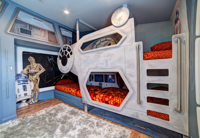 If a year without Disneyland has your kids itching for the Happiest Place on Earth, this 9-bedroom home in Anaheim home has enough Disney fun inside of it that kiddos missing their annual visit with the Mouse may just be A-OK. Little Jedis will be totally wowed by the kids' room, which has a double bunk bed designed to look like the Millennium Falcon; and, the young princesses will slumber happily inside their own tiny Snow White cottages. Plus, there's a full-size pool, ping pong table, foosball table, pool table—and ball pit room designed to look like a human-sized gumball machine, because why not?