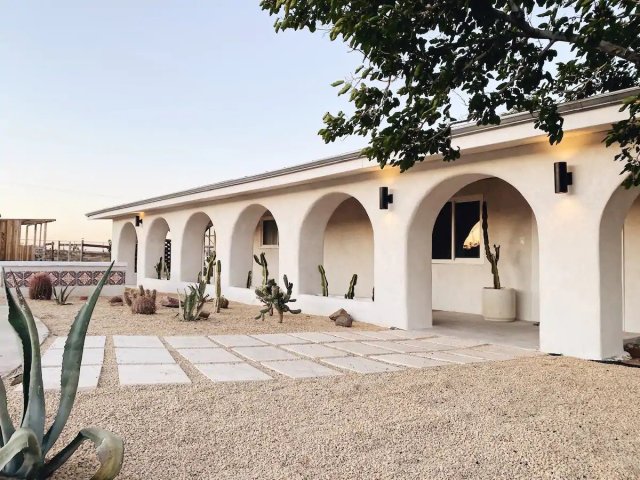 If stargazing is your thing, this one-of-a-kind desert home checks all the boxes. Besides being far from the light pollution of nearby cities, the three-bedroom home 20 minutes from Joshua Tree has a standalone dome observatory so you can get a closer look at our celestial neighbors. And don’t worry if you’re not a professional astronomer, the observatory uses software that lets you select a constellation on the computer for the telescope to automatically rotate accordingly. Besides that stellar experience (which, let’s be honest, is reason enough to visit), the rental also has two game rooms (with a pool table, ski ball, and shuffleboard table), an outdoor hot tub, and a fire pit. Perched on a hill in the middle of the rocky landscape, it also has 360-degree views of the surrounding area.