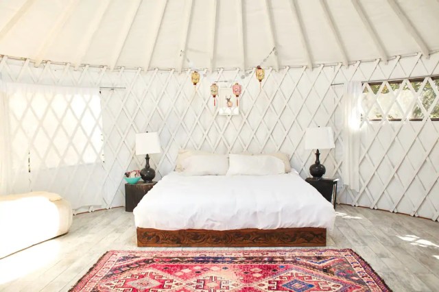 Enjoy a night on the farm inside your very own tipi at this Temecula-area farm stay where the animals are the real stars of the show. You’ll sleep on comfy floor mattresses inside an authentic teepee surrounded by farm animals, including a whole herd of goats (Pssst: Two new babies were just born in May!), chickens, miniature horses, pigs, and one lama. The tipi has a bathroom, hot shower, propane fire pit (the tent is ventilated enough so that it’s safe—we asked!), fridge, mini kitchen, Wifi, 2 twin beds, and a queen bed. When you’re not hanging in the tipi, your fam is free to roam the fruit orchards; pet, brush, or feed the animals; and play on the tree swing. You can even help milk the goats if that’s your thing.