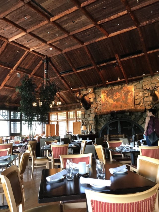 A cozy, lodge-like space, the Bear Mountain Inn's restaurant is currently not open for dining.