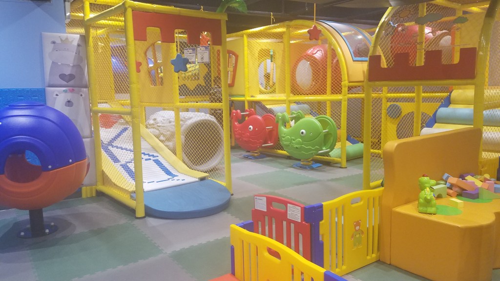 Peek-A-Booo has two on-site bathrooms, and one has a changing table. There’s also a little section with tables and chairs for snack time, however, no food or drink is permitted near the ball-pits, climbing structures, and games.
