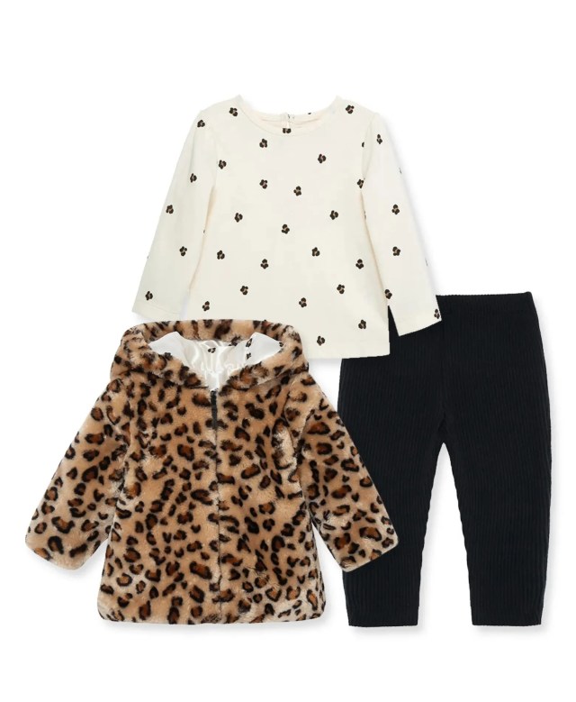 Little Me Leopard Print Faux Fur Hooded Jacket, T-Shirt & Leggings ($68.00 $43.99)—Buy Here!